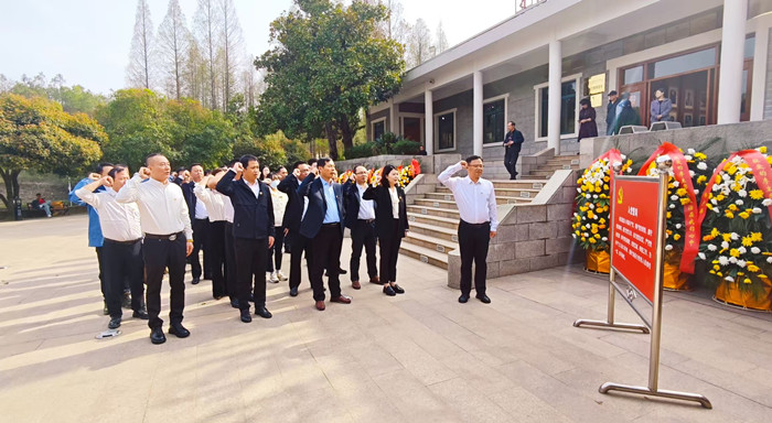 三家單位的40余名黨員代表齊聚李先念故居紀(jì)念園。進(jìn)入紀(jì)念園,莊重的敬獻(xiàn)花籃儀式拉開帷幕,黨員代表們邁著整齊且緩慢的步伐,手捧花籃,緩緩行至李先念同志雕像前,輕輕放下花籃,承載著全體黨員對(duì)革命先輩的無盡追思與崇高敬意。現(xiàn)場,全體黨員神情肅穆,深深鞠躬,向李先念同志致以深切緬懷。