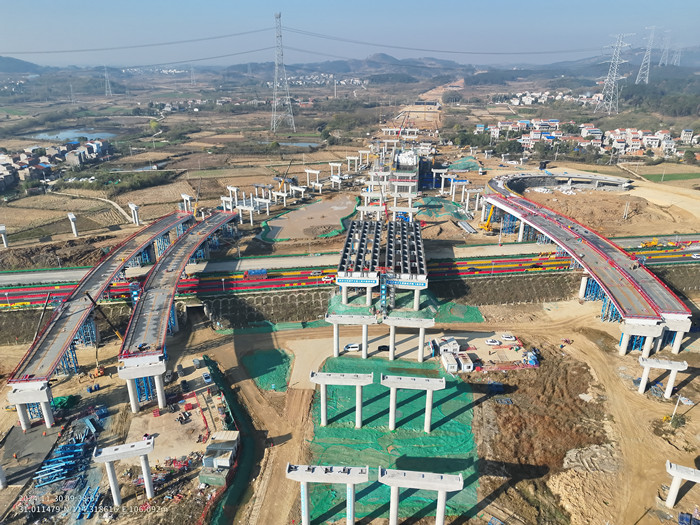 研子崗樞紐互通跨武漢至大悟高速公路6聯(lián)鋼箱梁總用鋼量約4350t,各聯(lián)均采用支架吊裝法施工。主線橋?yàn)閱慰绾?jiǎn)支鋼混組合梁,跨徑62m,左右兩幅對(duì)稱布置,總寬34m,用鋼量785t;匝道橋共4聯(lián),各匝道均為組合跨徑(40+60+40)m連續(xù)鋼箱梁。該處鋼箱梁跨越雙向六車道的武大高速,涉路施工手續(xù)辦理復(fù)雜,協(xié)調(diào)難度大,跨徑大,施工安全風(fēng)險(xiǎn)大,現(xiàn)場(chǎng)吊裝焊接質(zhì)量管控難度大,項(xiàng)目公司組織參建單位提前部署、優(yōu)化方案、多級(jí)聯(lián)動(dòng),截至11月29日,研子崗樞紐互通跨武漢至大悟高速公路6聯(lián)鋼箱梁安全順利完成吊裝。